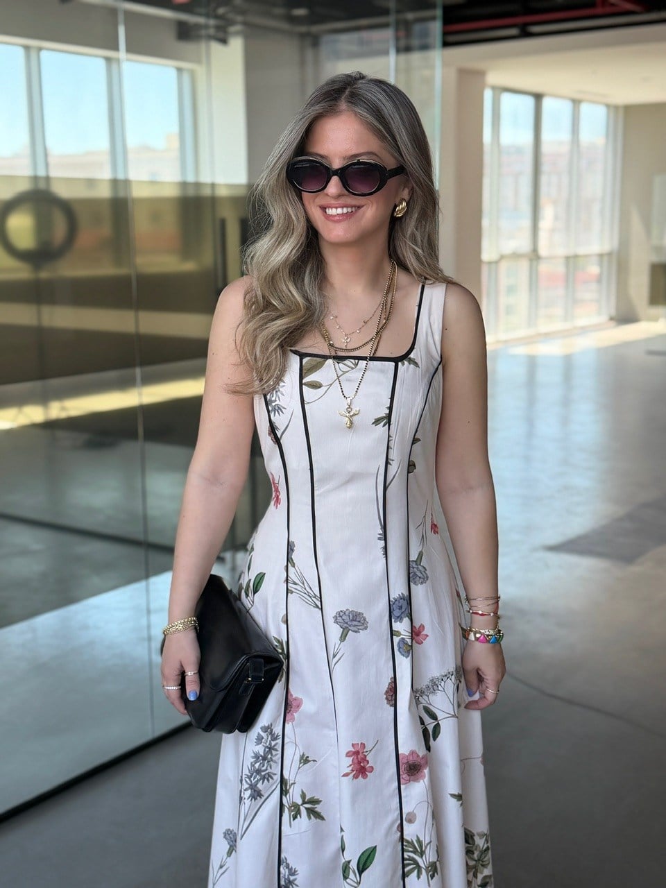 %100 Pamuk Çiçek Desenli Siyah Biyeli Midi Elbise - Ekru