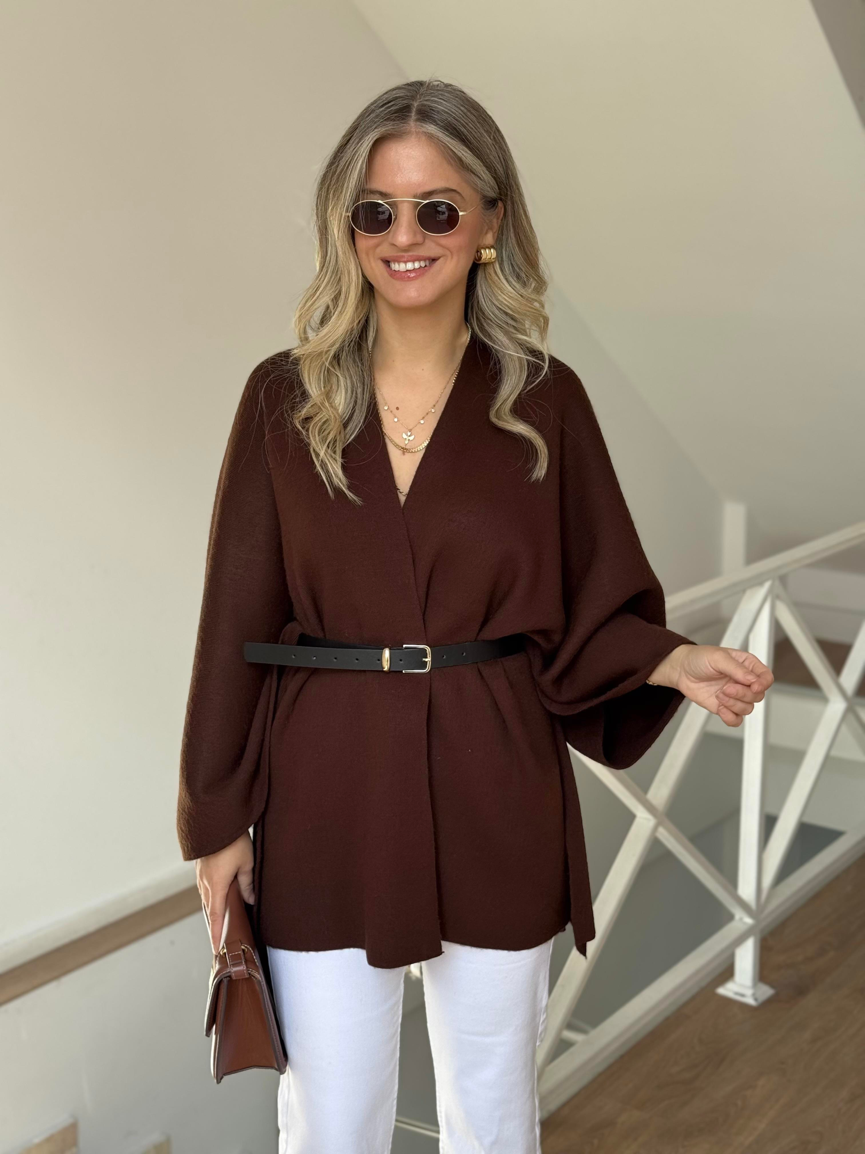 Beli Kemerli Triko Şal Bluz - Kahverengi
