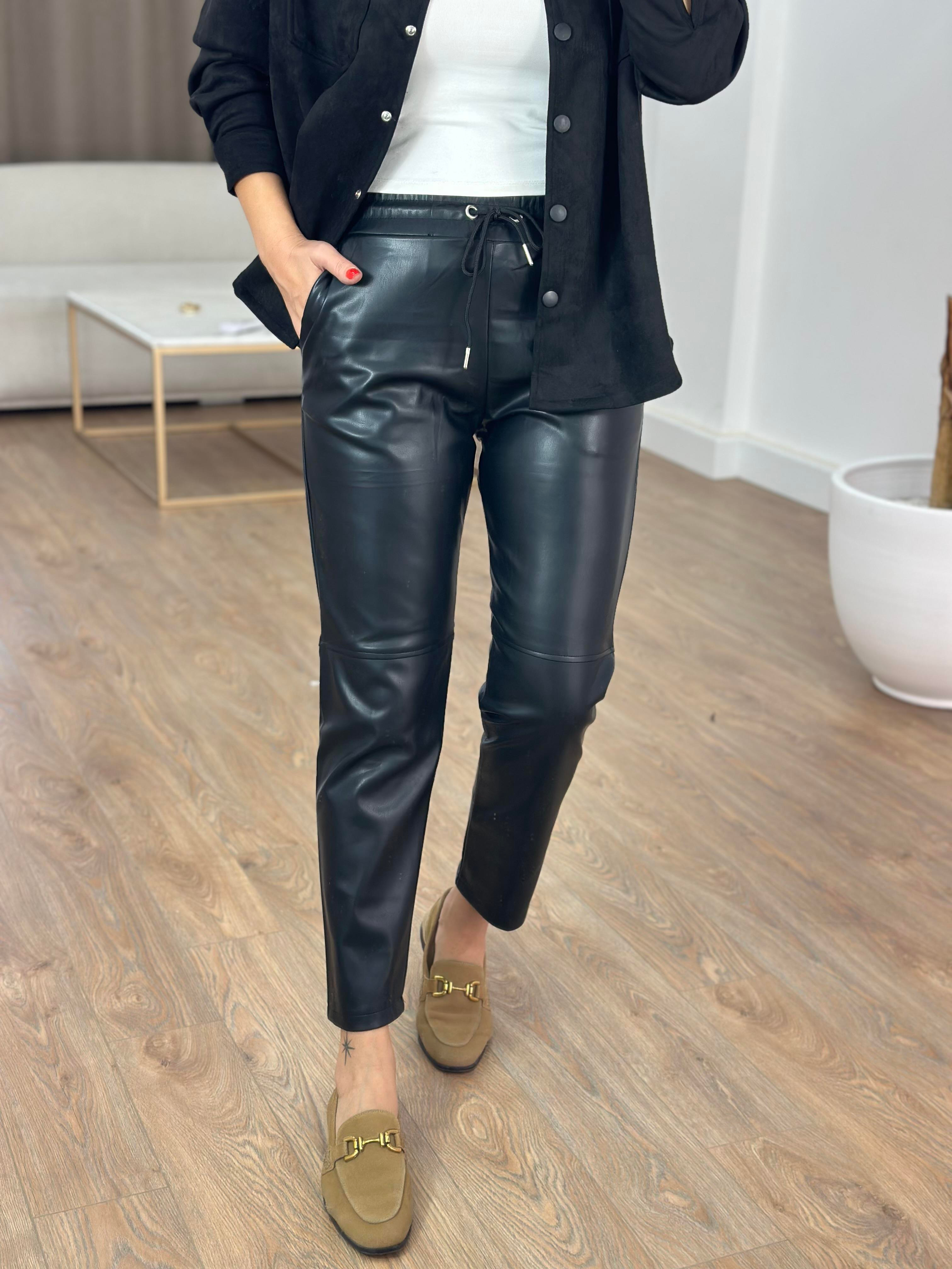 Beli Lastikli Deri Havuç Pantolon - Siyah