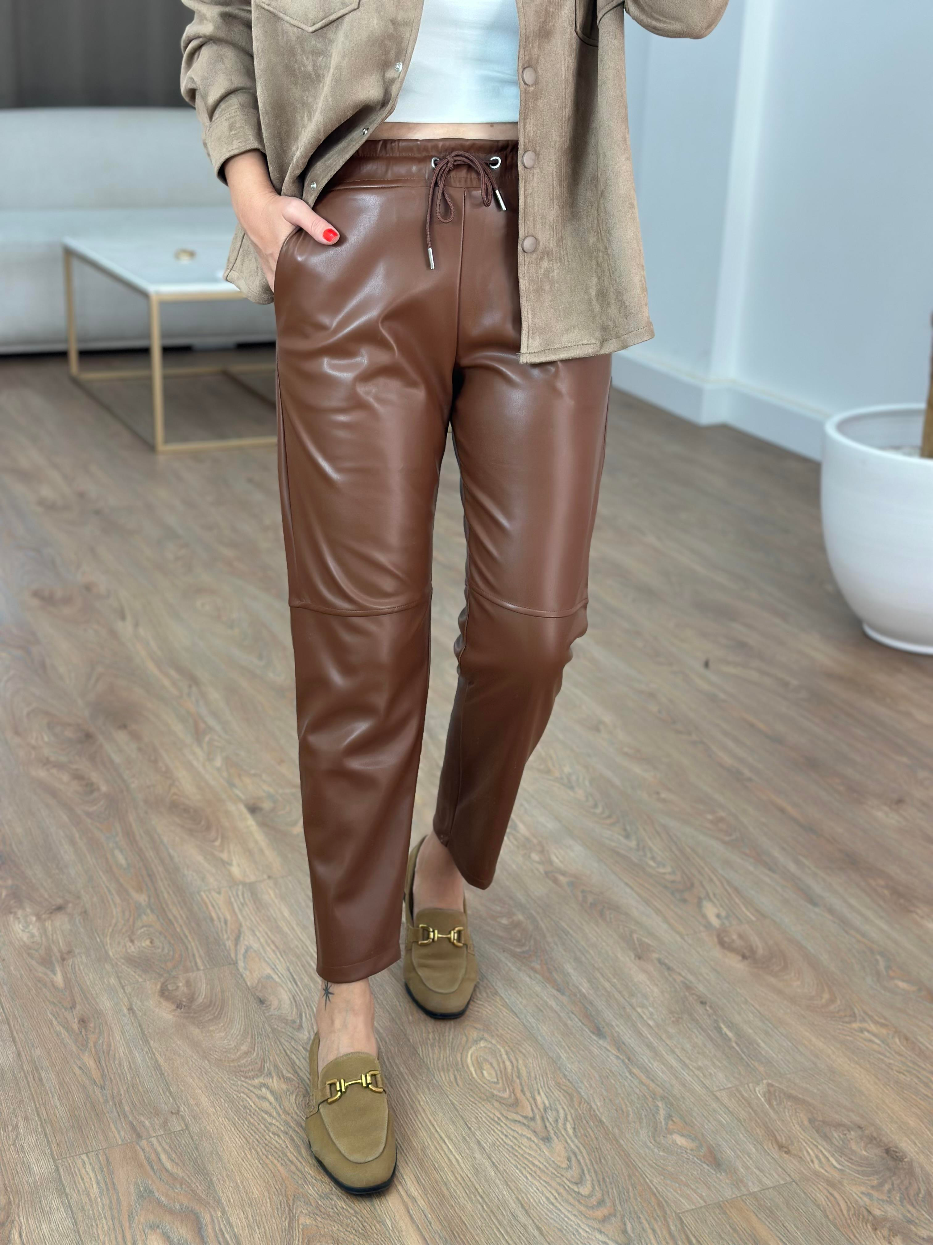 Beli Lastikli Deri Havuç Pantolon - Taba