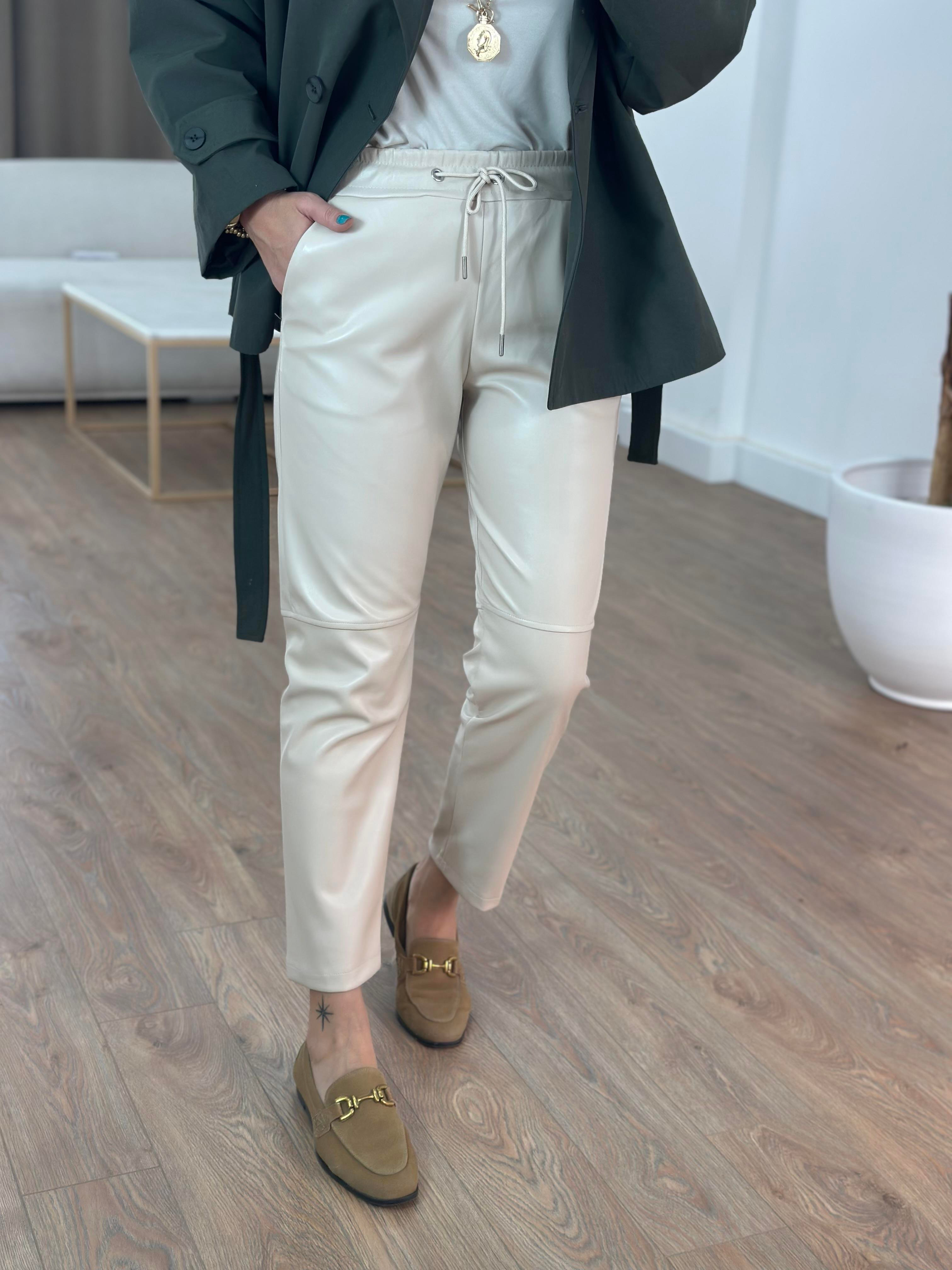 Beli Lastikli Deri Havuç Pantolon - Taş