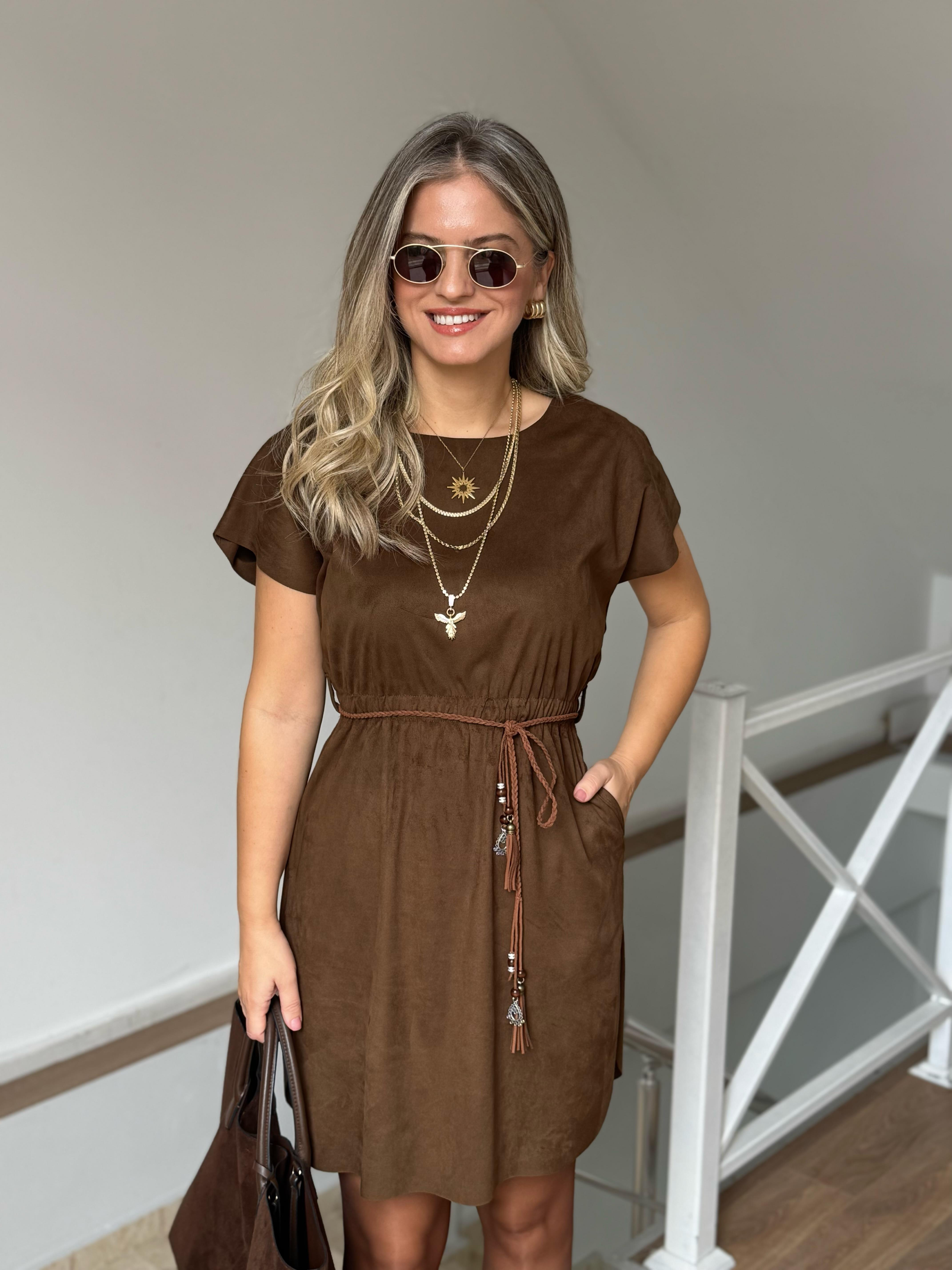 Beli Lastikli Kemerli Süet Elbise - Kahverengi