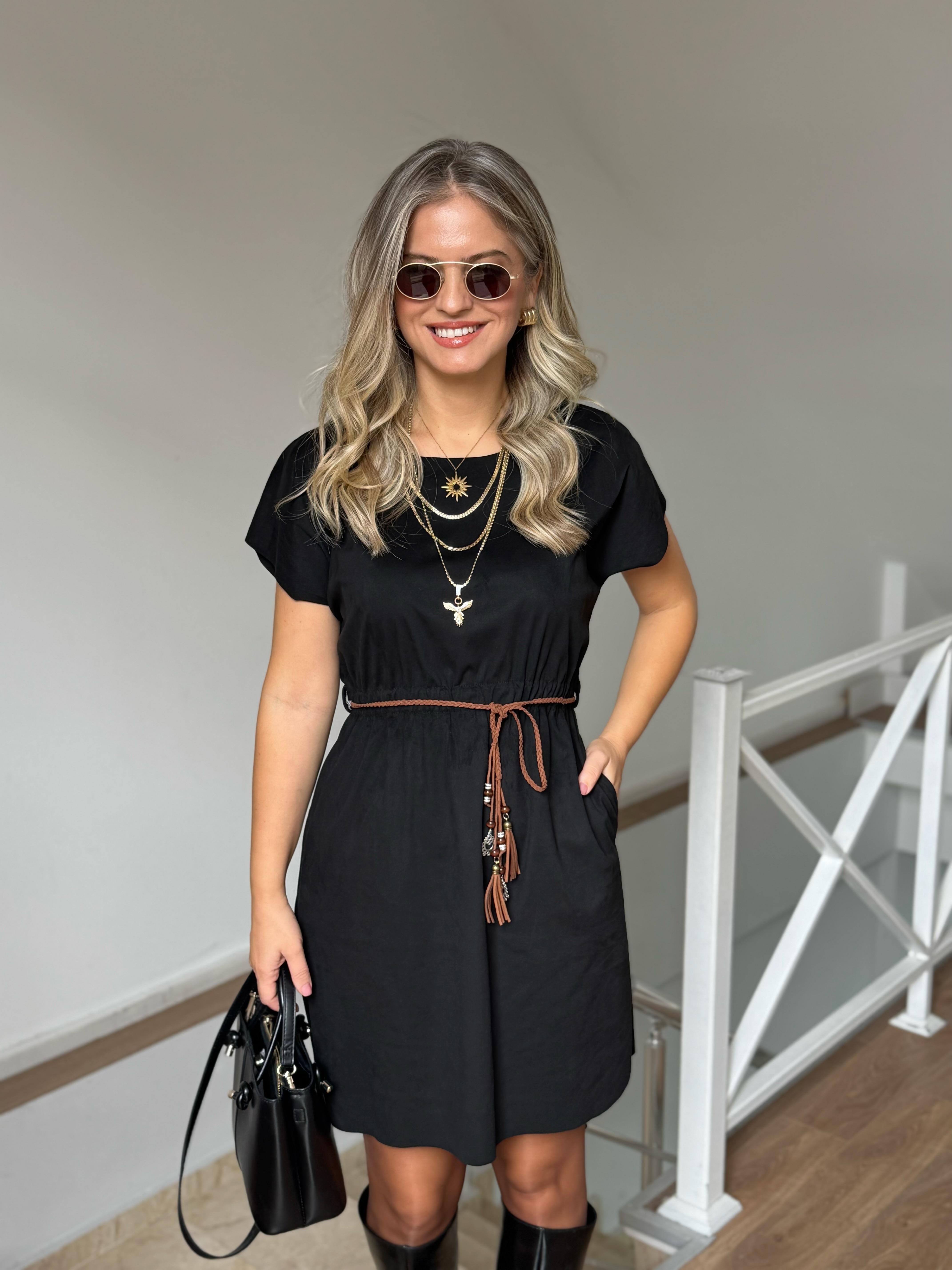 Beli Lastikli Kemerli Süet Elbise - Siyah