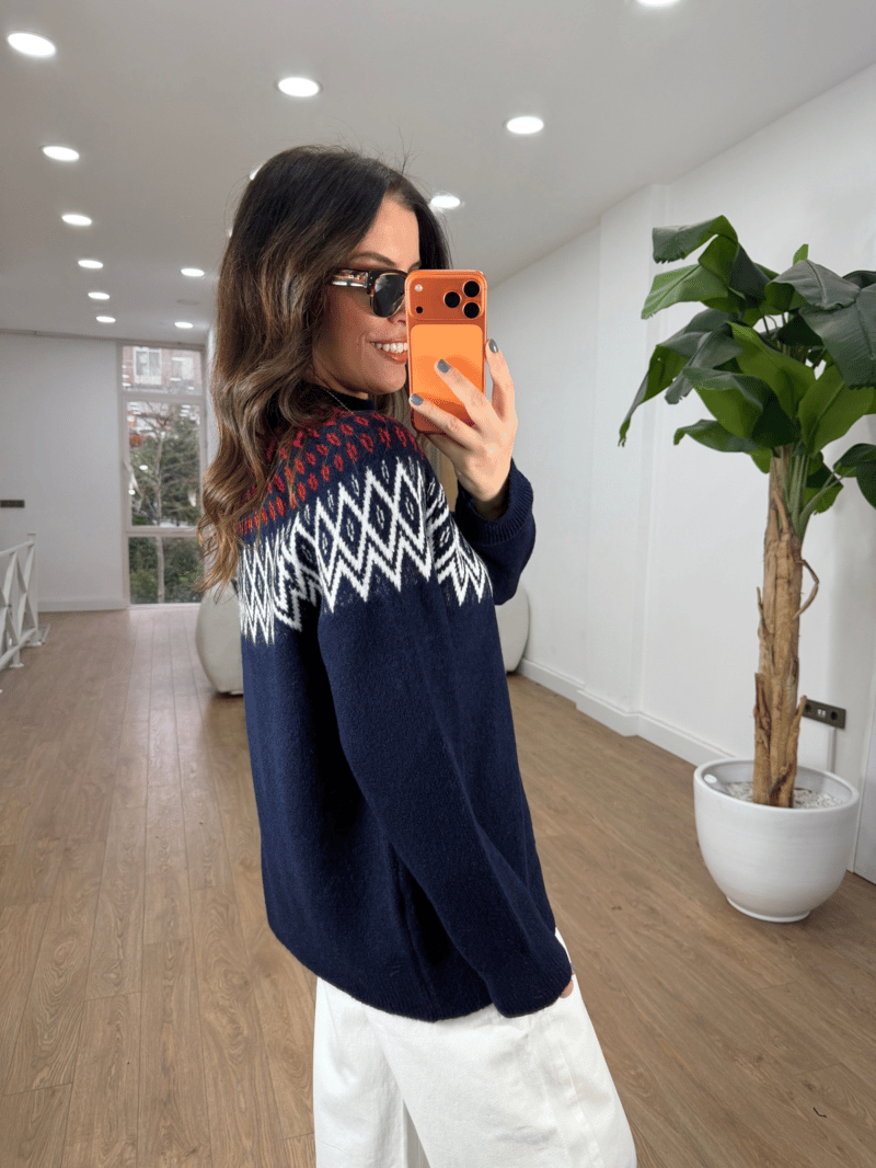 Bisiklet Yaka Etnik Desenli Kazak - Lacivert