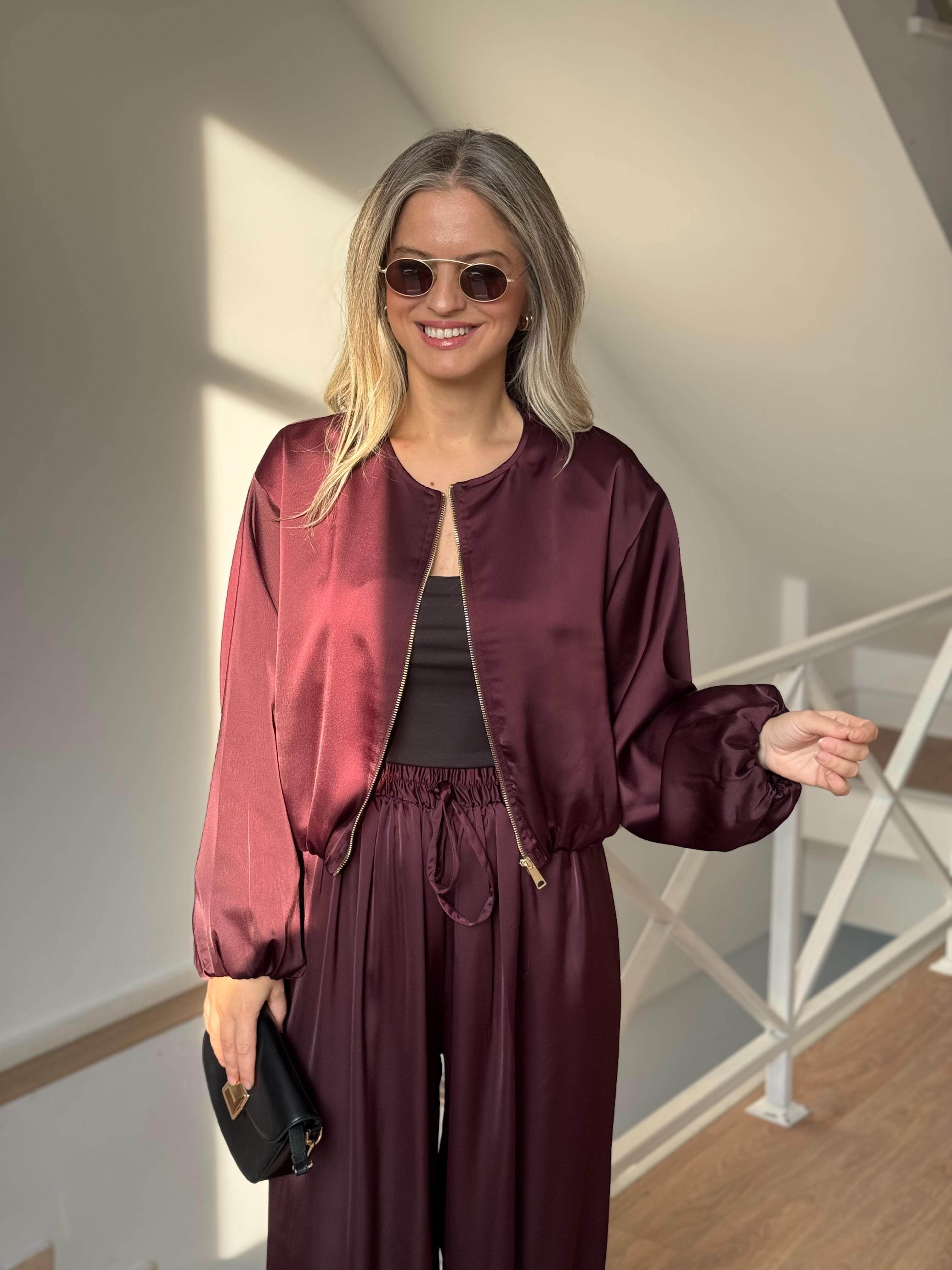 Bomber Saten Pantolon Ceket Takım - Mürdüm
