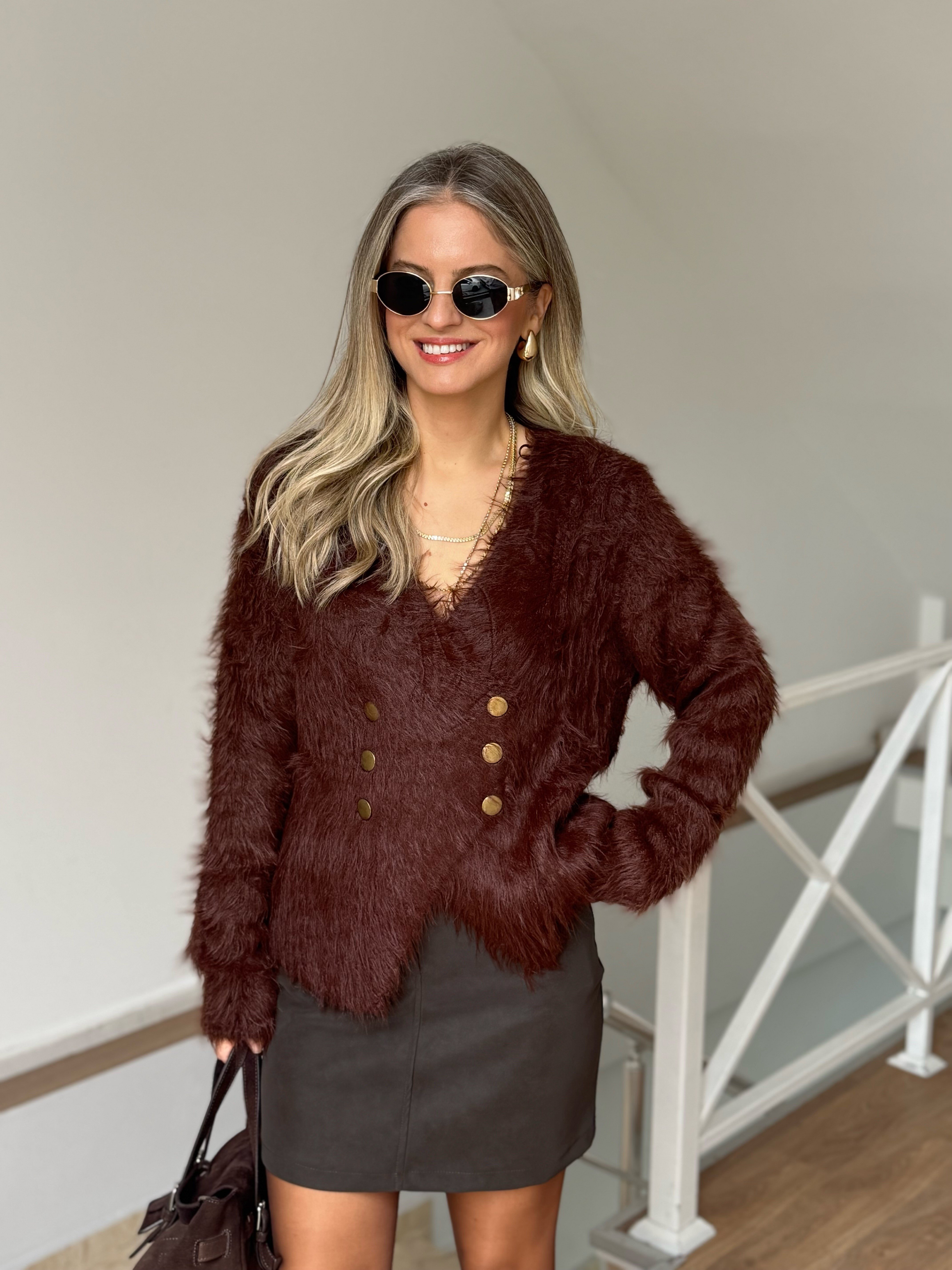 Çapraz Kapama Angora Tüylü Hırka - Kahverengi