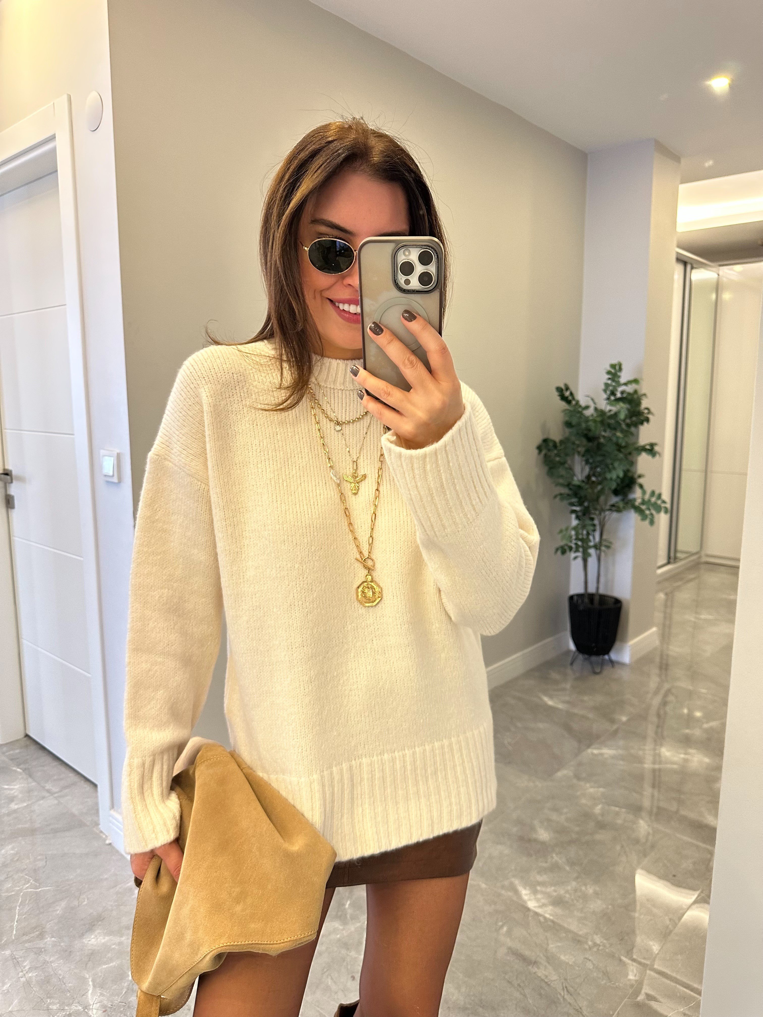 Dekoratif Detaylı Basic Triko Kazak - Krem