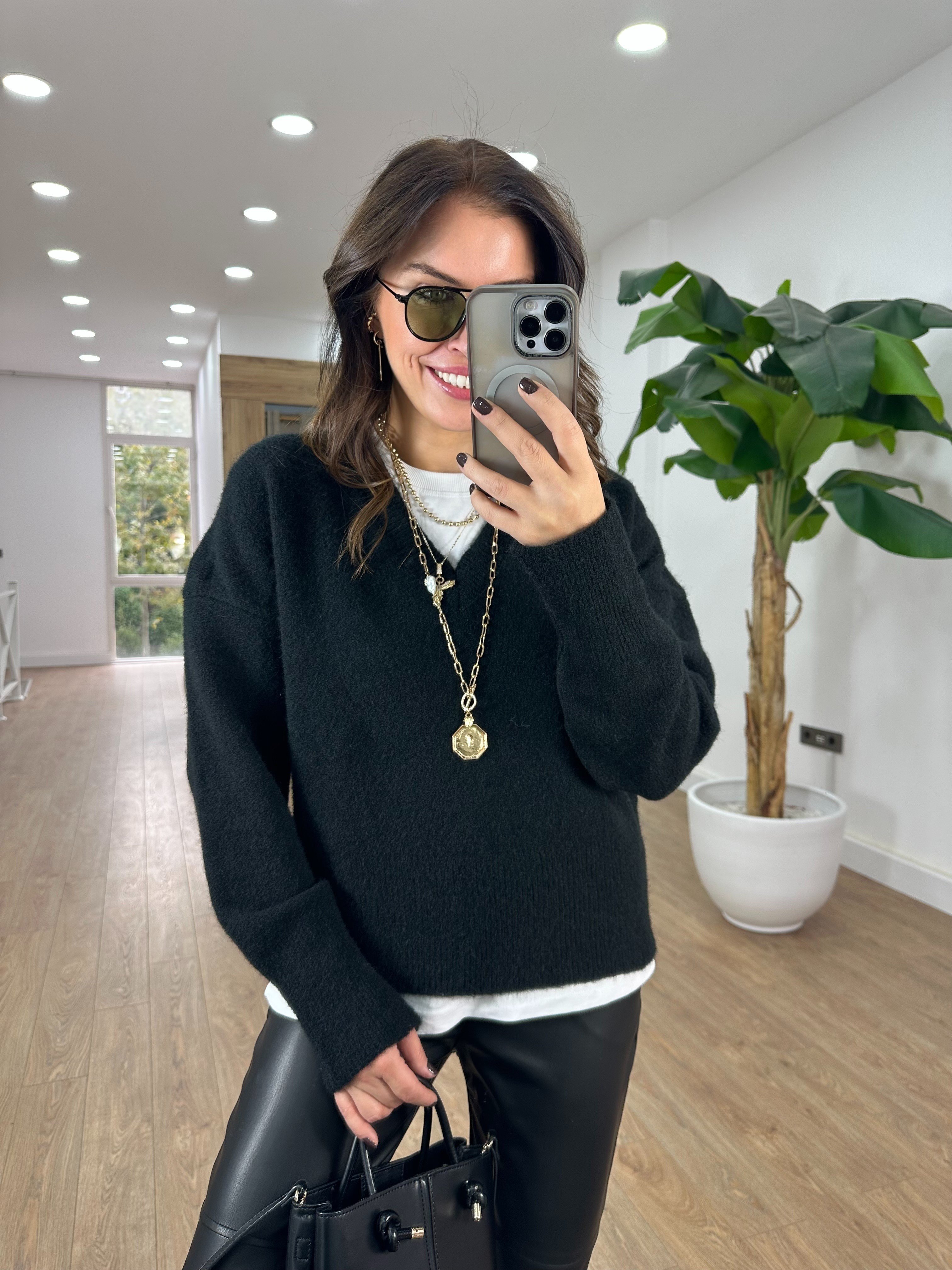 Dekoratif V Yaka Yumoş Kazak - Siyah