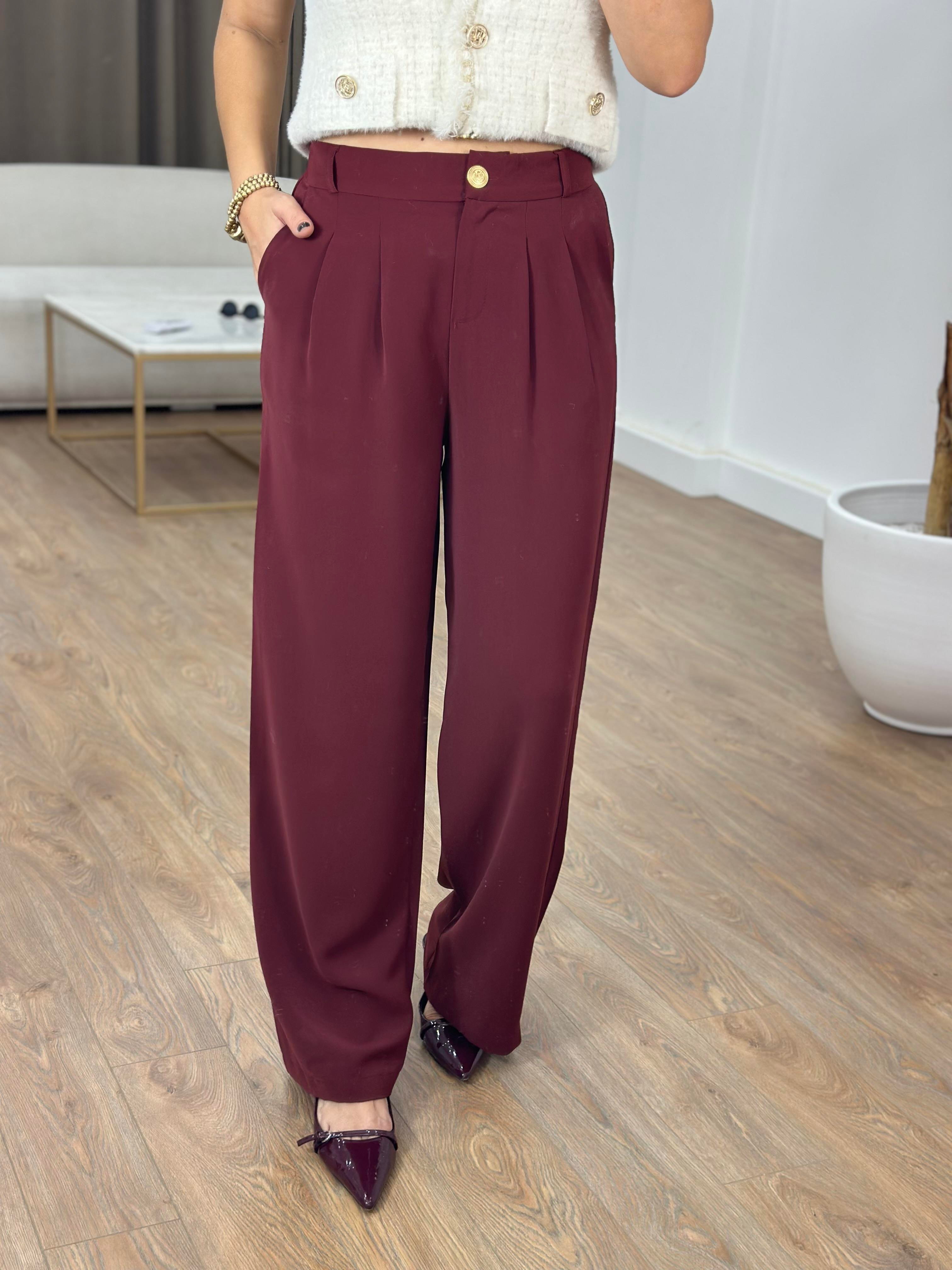 Gold Düğmeli Palazzo Pantolon - Bordo
