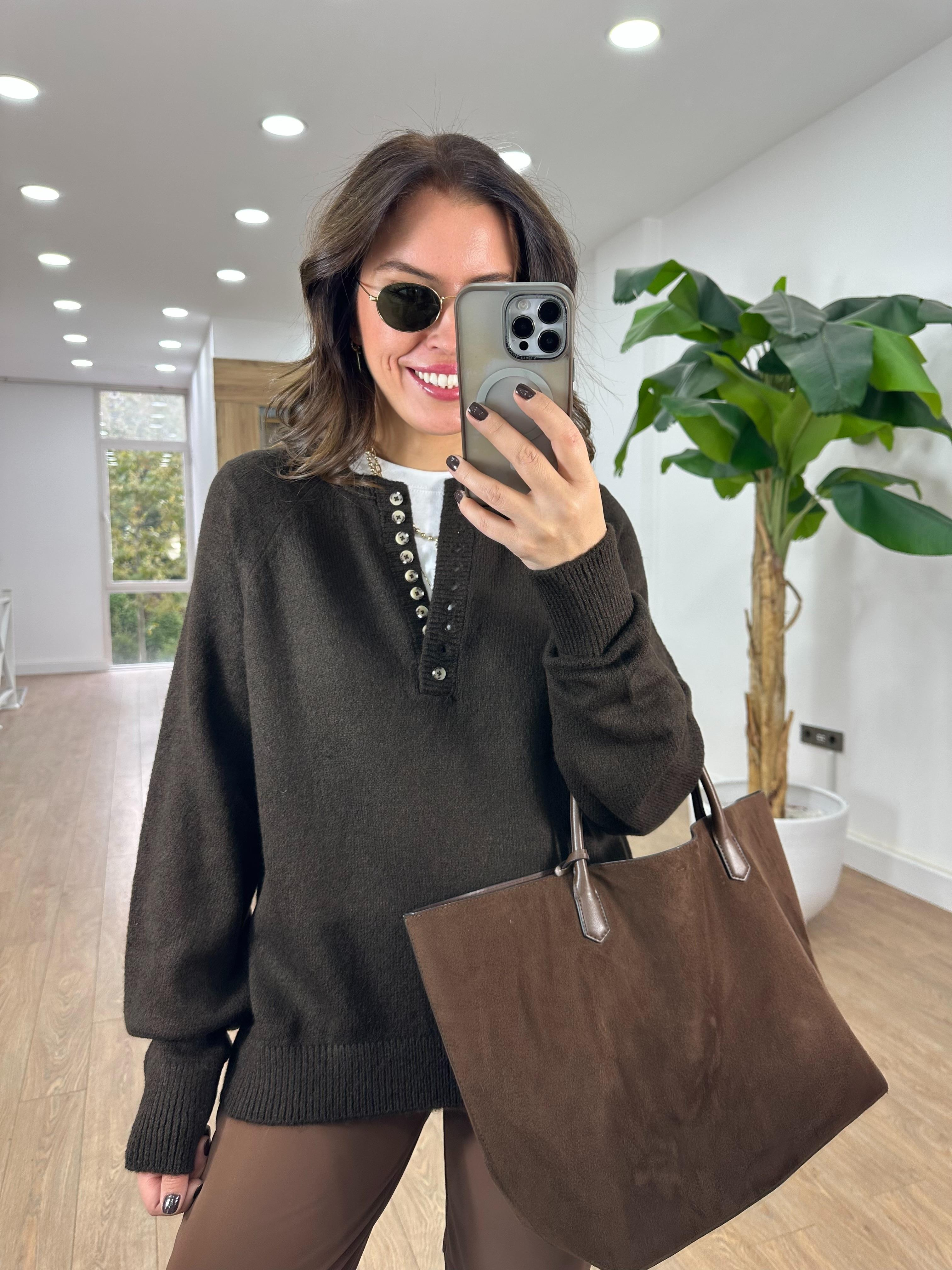 Patlı Düğmeli Kazak - Koyu Kahve