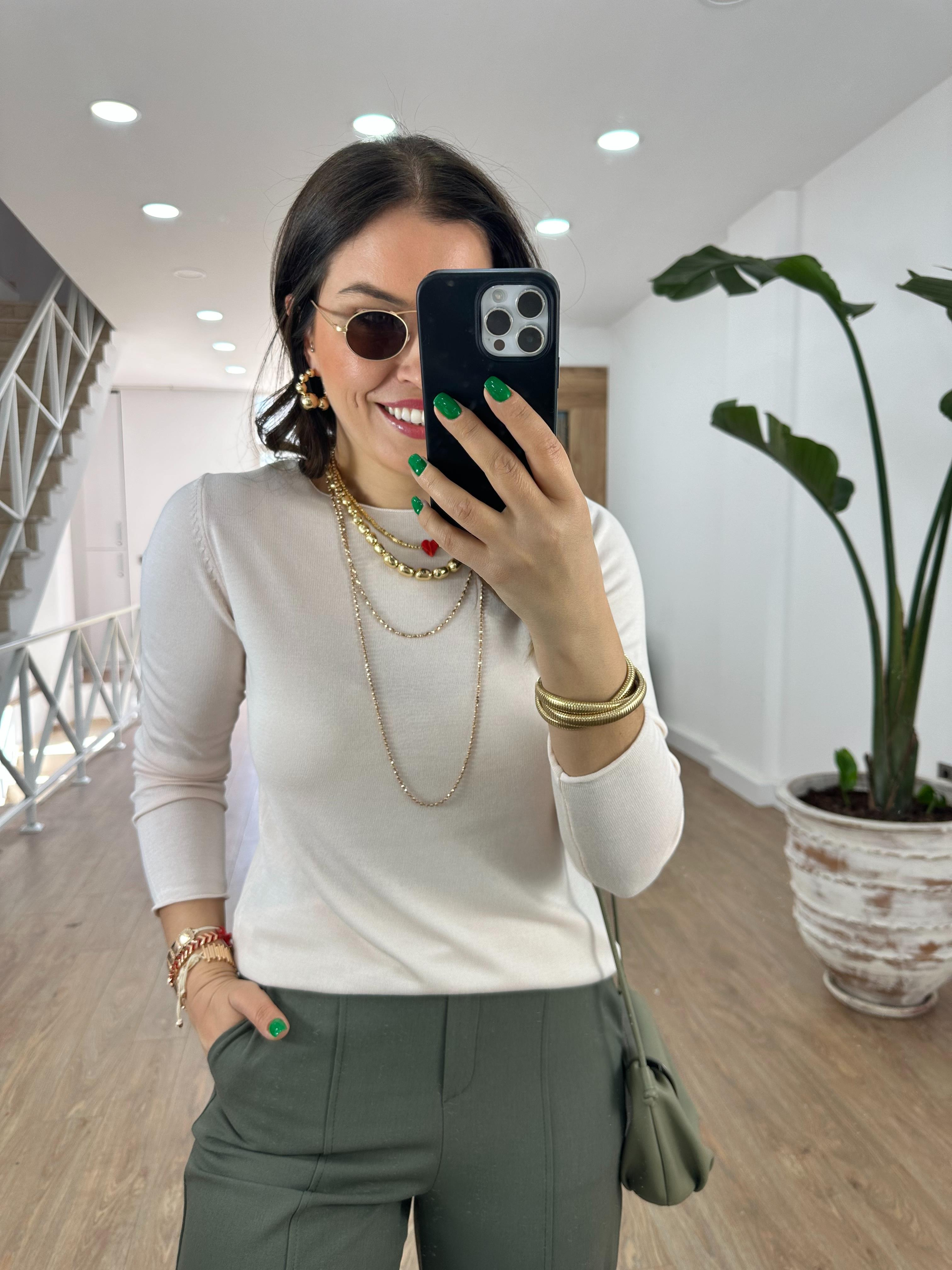 Premium Kalite Bisiklet Yaka Basic Triko-Krem