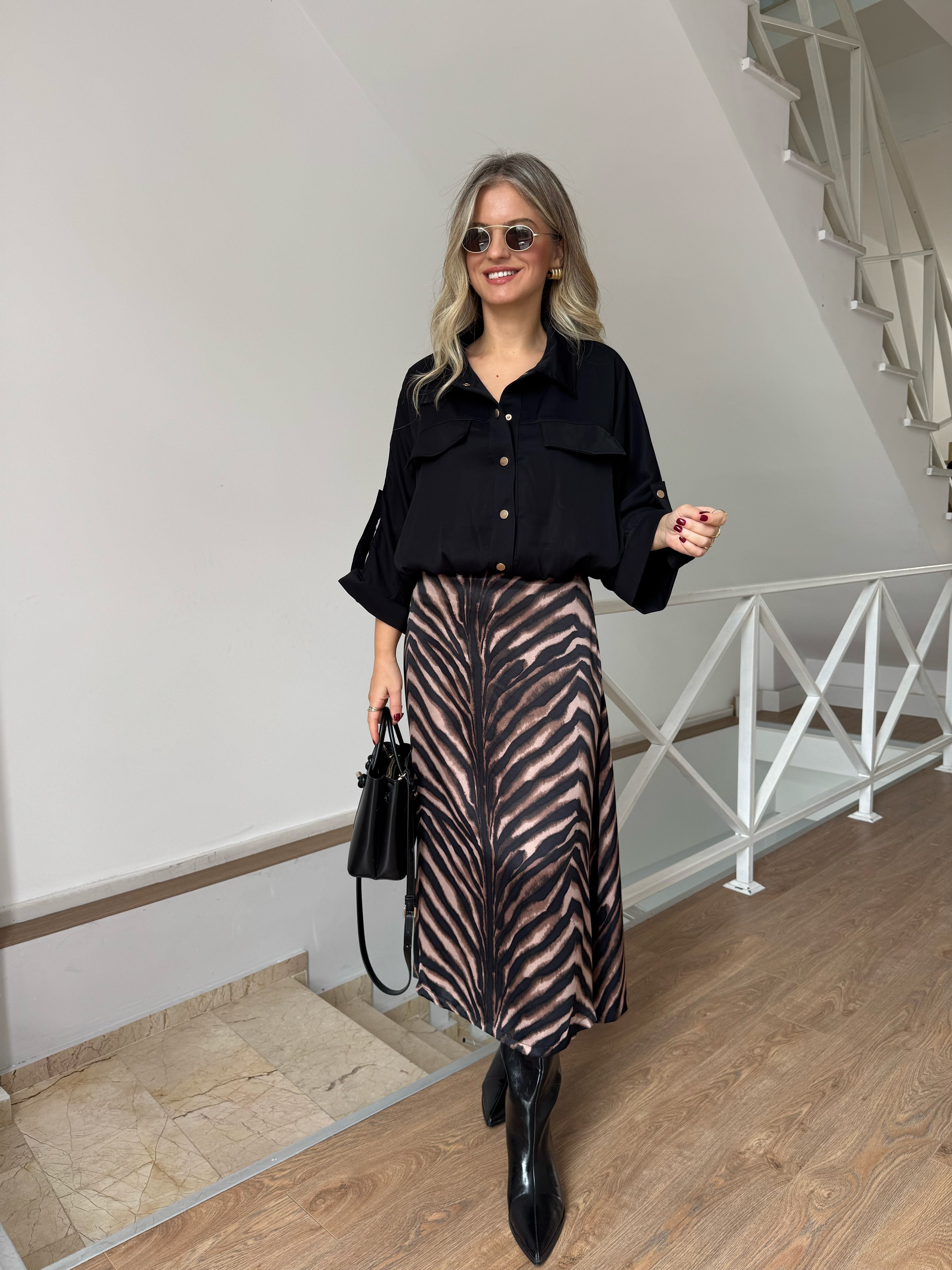 Zebra Desenli Midi Boy Etek - Kahverengi